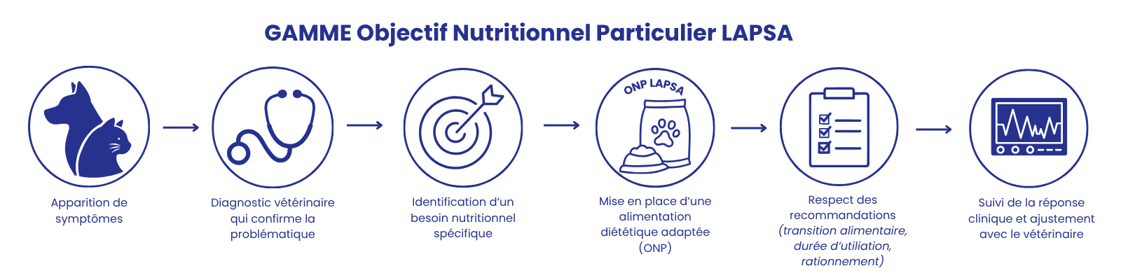 Chaque produit ONP LAPSA répond à un Objectif Nutritionnel Particulier afin de venir supporter le temps qu’il faudra des fonctions physiologiques défaillantes de votre animal.